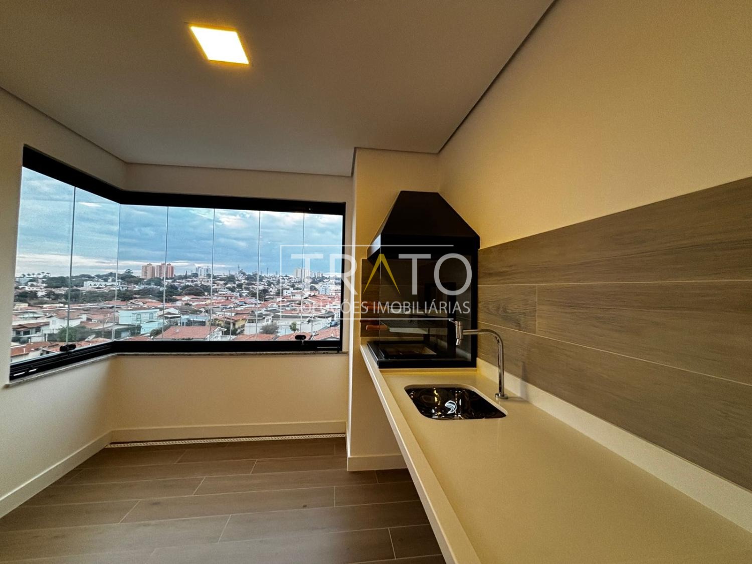 Living integrado com Terraço Gourmet este com bancada de quartzo branco e fechamento em blindex, churrasqueira a carvão completa, gesso.