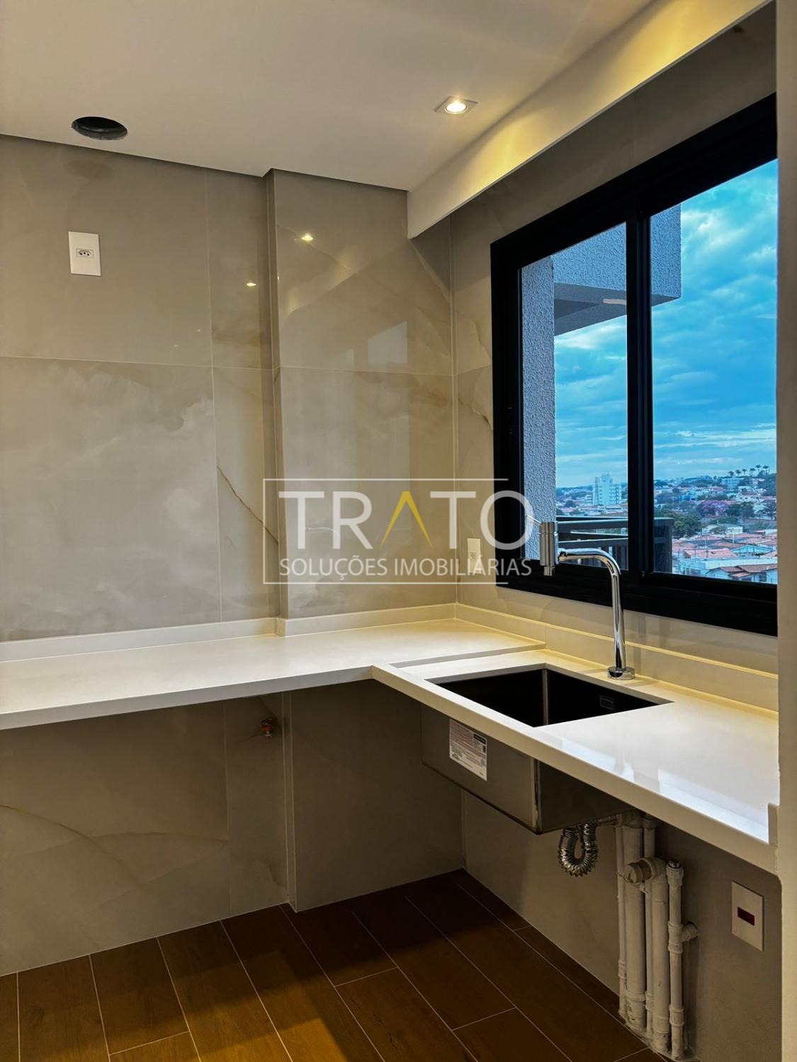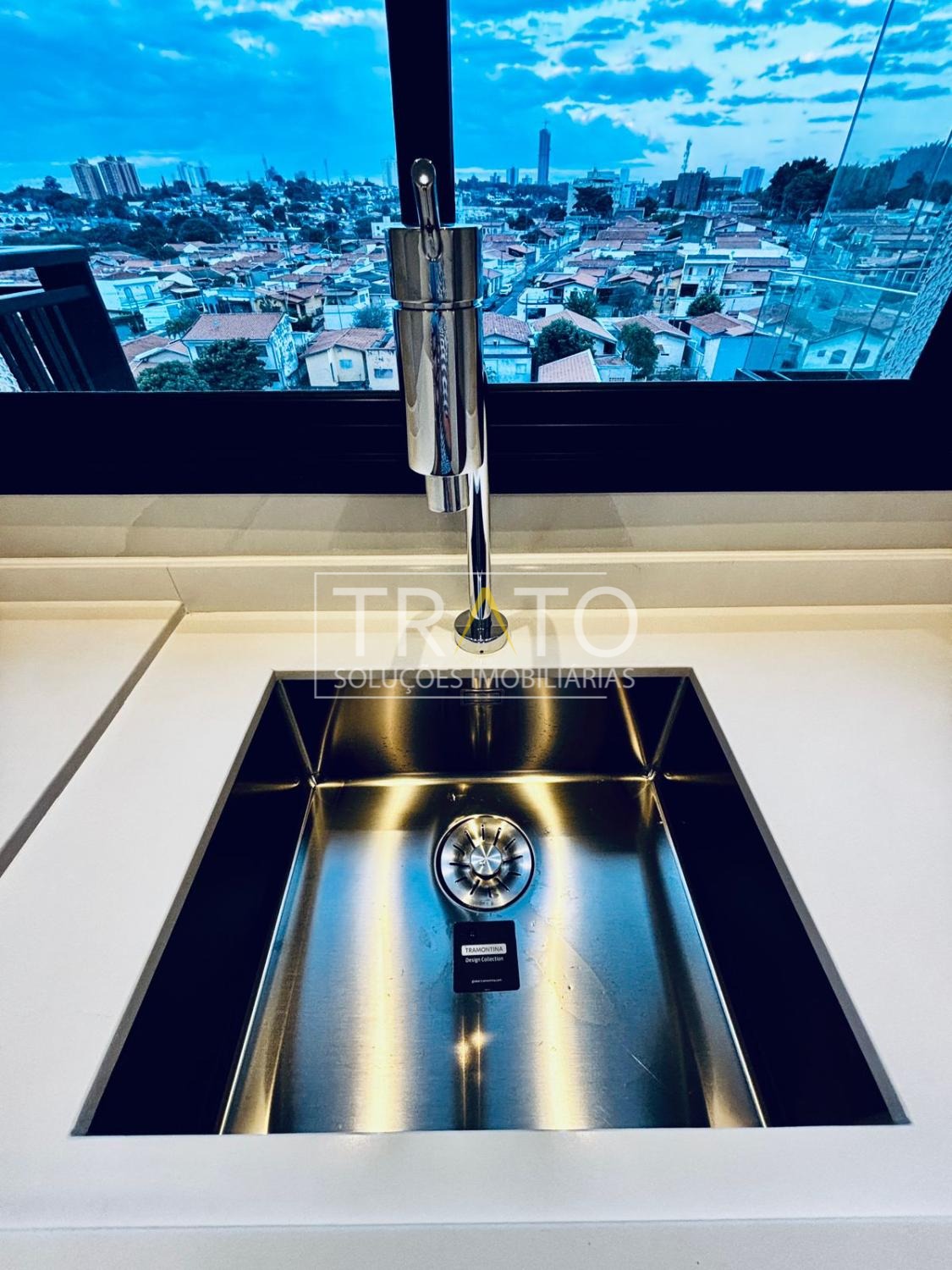 Cozinha preparada para fogão de indução, pia e bancada de quartzo branco, azulejo Eliane, cuba inox Tramontina diferenciada;