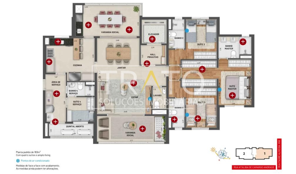 • Plantas Magníficas: Escolha entre 163m² (3 suítes) ou 189m² (4 suítes), ambas com layouts amplos e flexíveis. Conte ainda com a possibilidade de uma Suíte de Serviço Aconchegante (4ª suíte), perfeita para visitas ou cuidadores.