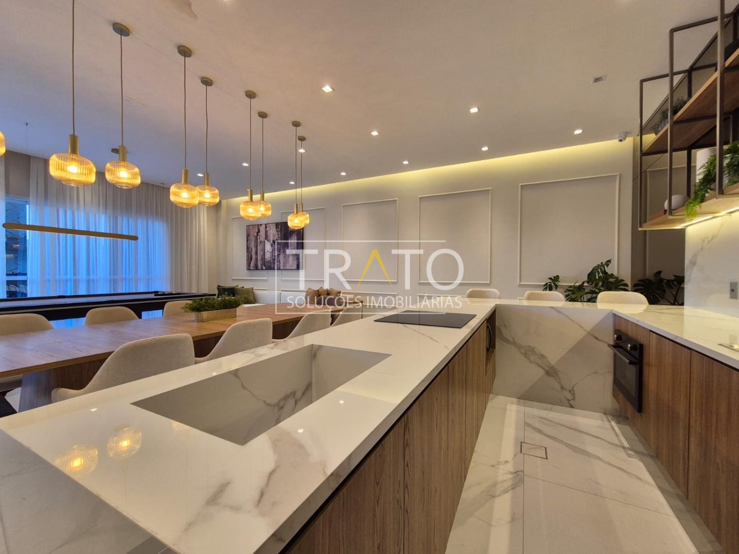 A cozinha em conceito semiaberto integra os ambientes na medida certa, mantendo conexão com a sala sem perder funcionalidade.
