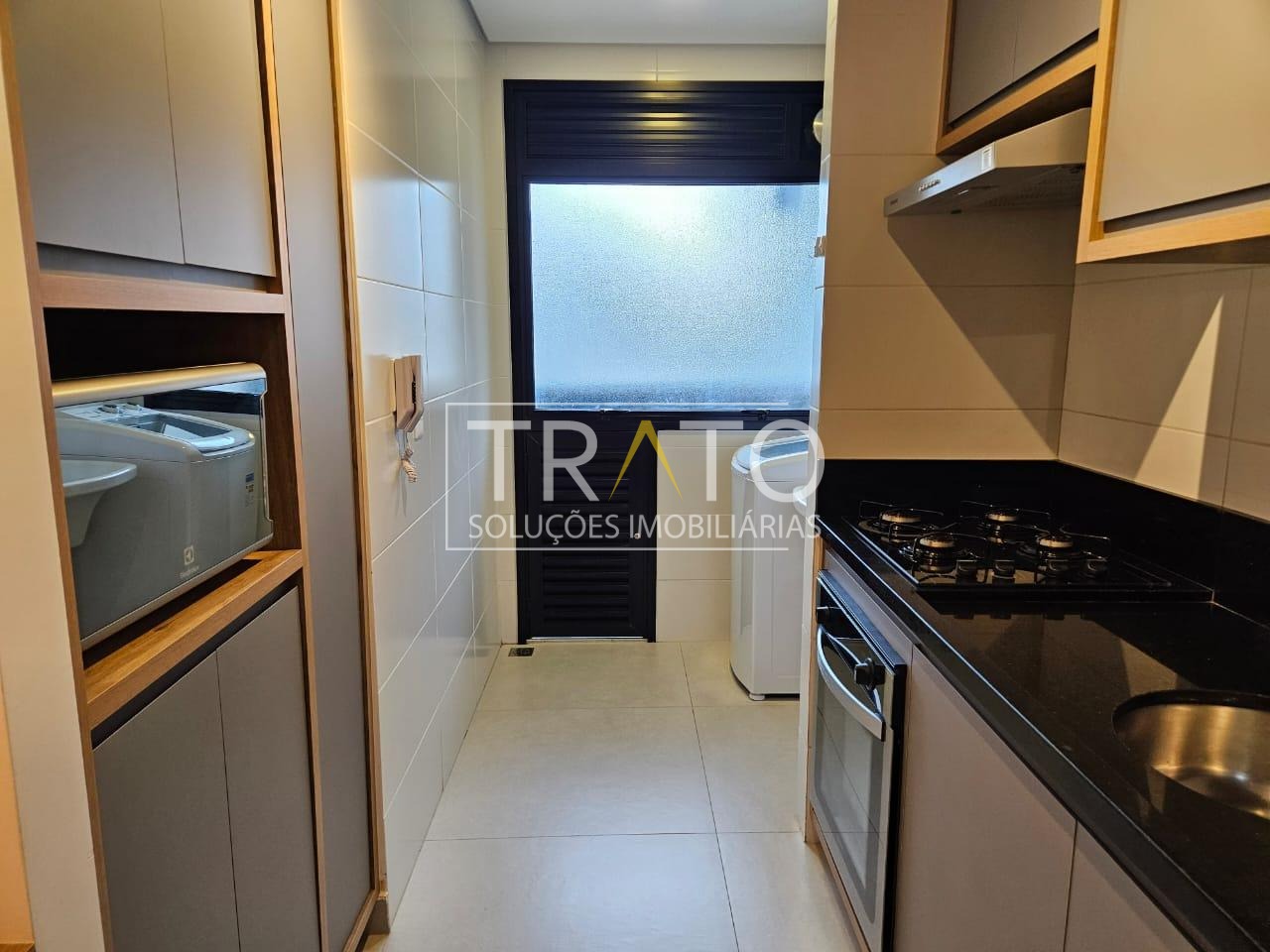 * Cozinha: equipada com armários planejados, cooktop, forno e depurador, geladeira.