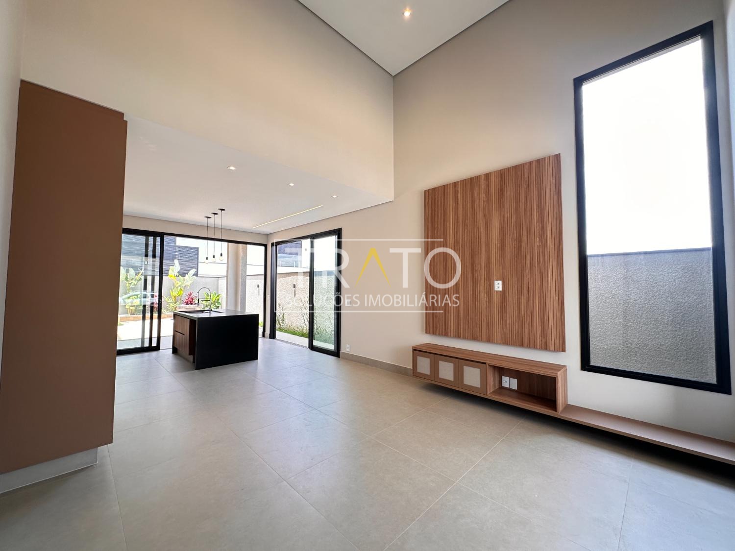 Sala de estar/jantar com pé direito duplo.