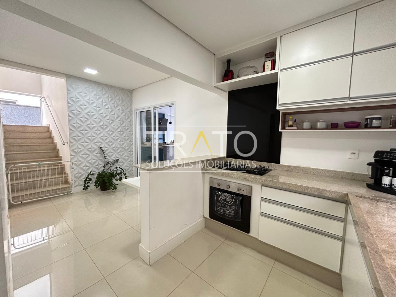 No piso inferior, sala para 2 ambientes, com pé direto duplo, cozinha americana rica em armários planejados, lavabo, espaço gourmet com churrasqueira.