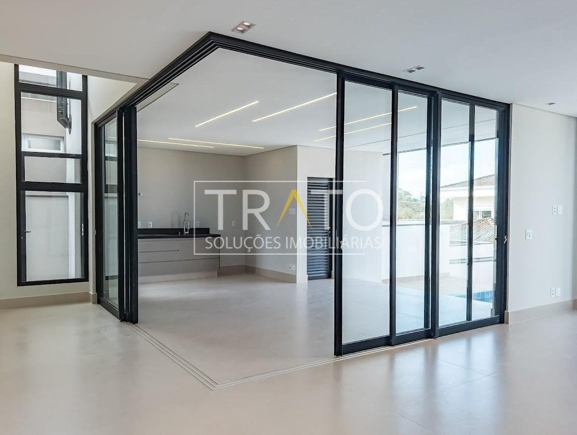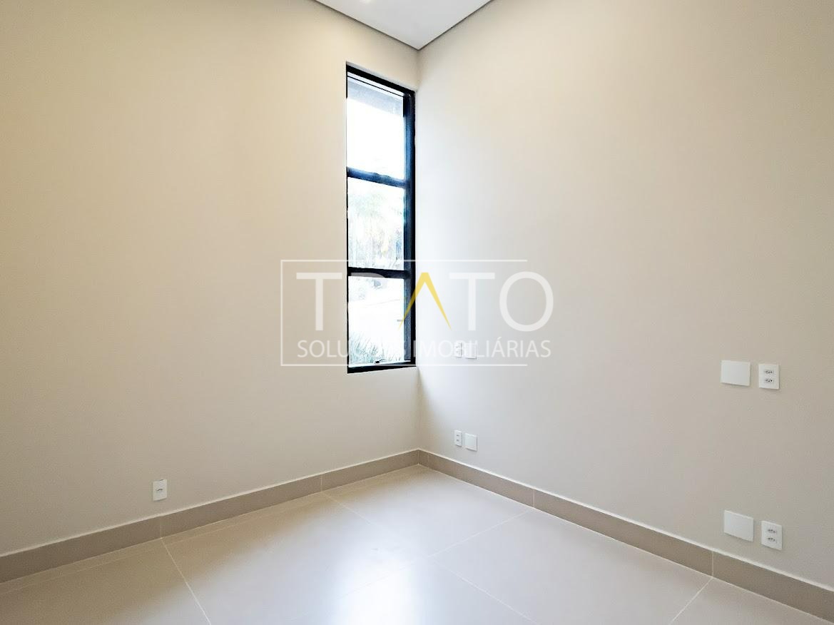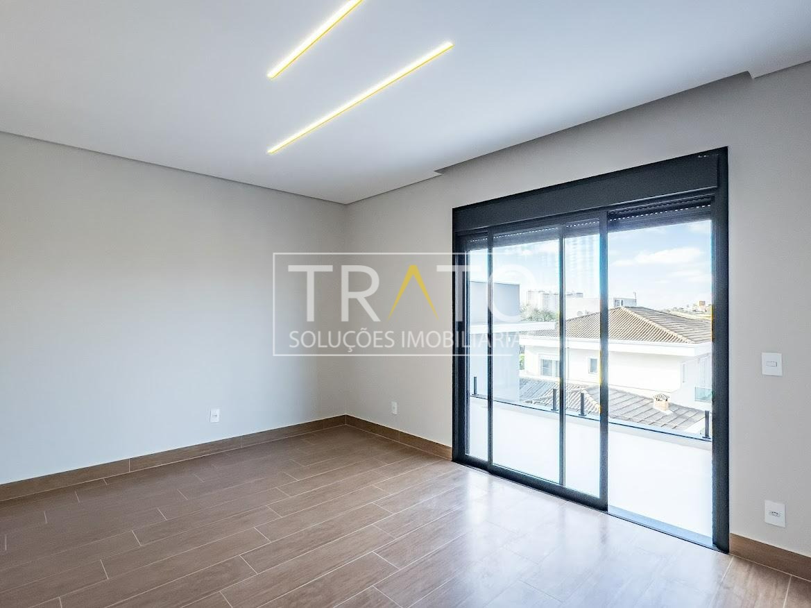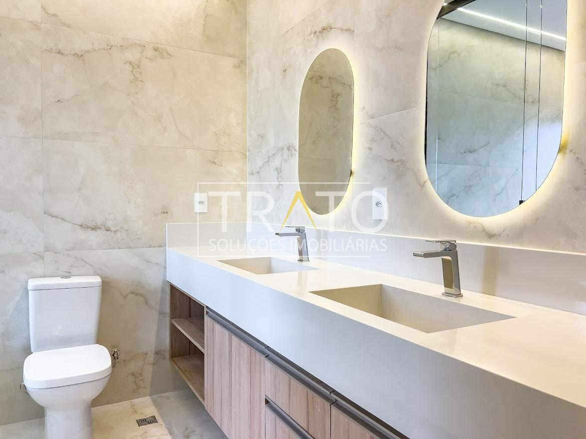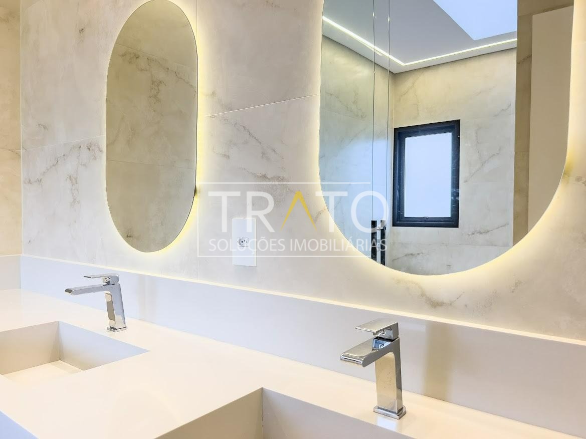 Residência moderna no Condomínio Zurich Dorf, Valinhos. Conta com 3 suítes no piso superior e 1 cômodo multiuso no térreo (opção de 4ª suíte ou escritório). São 5 banheiros no total, sendo 3 nas suítes, 1 integrado ao cômodo multiuso (lavabo) e 1 de apoio à área gourmet.