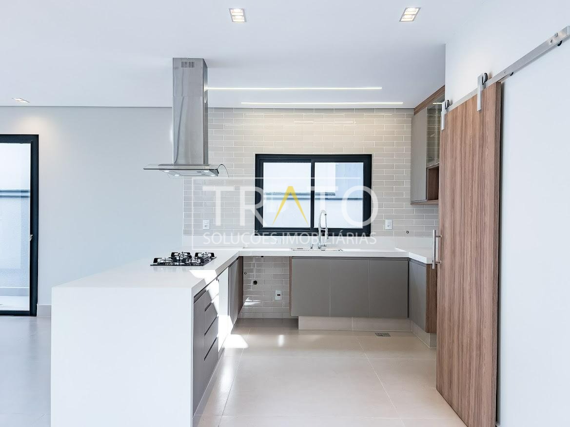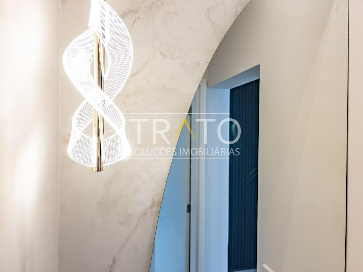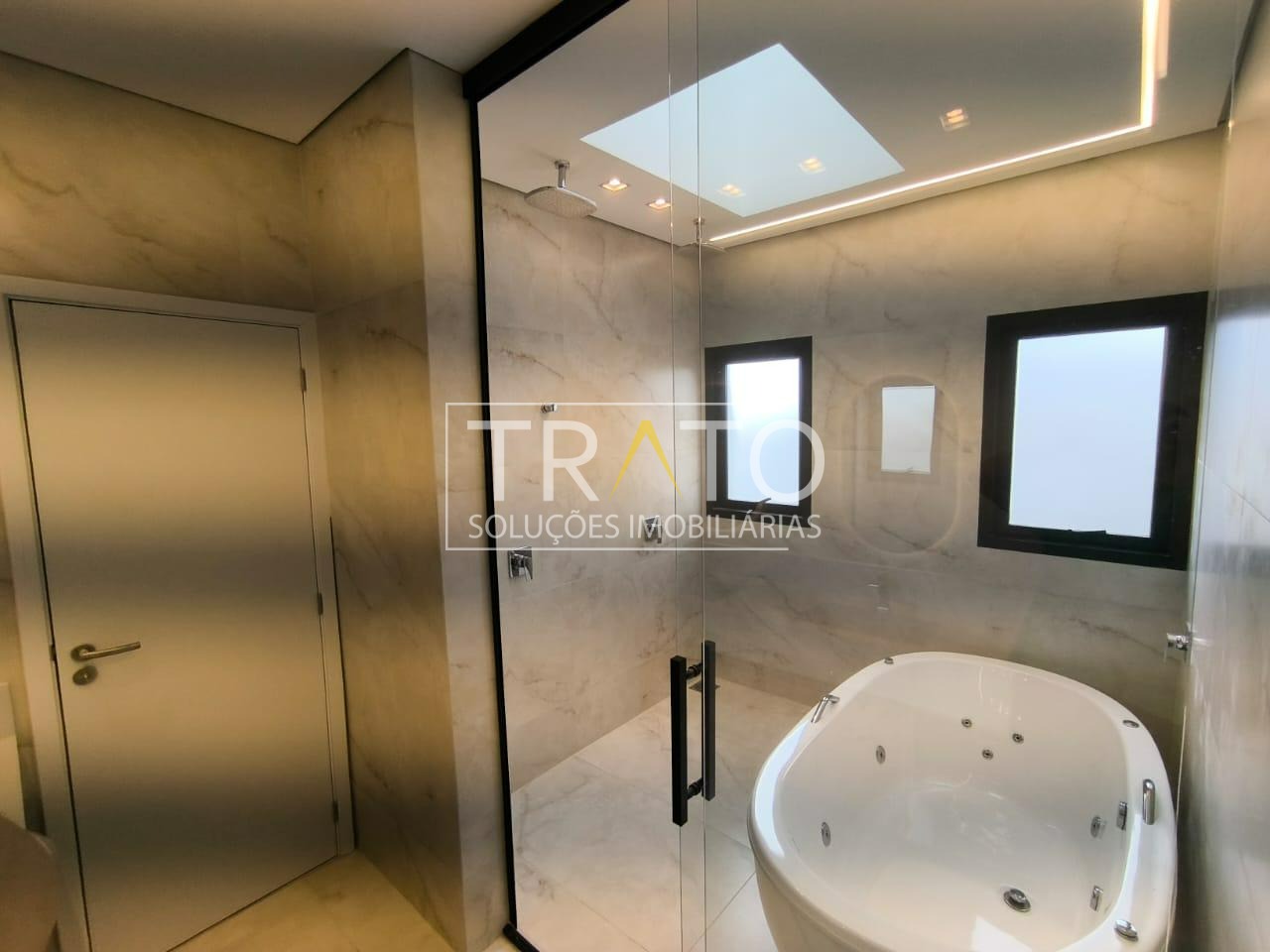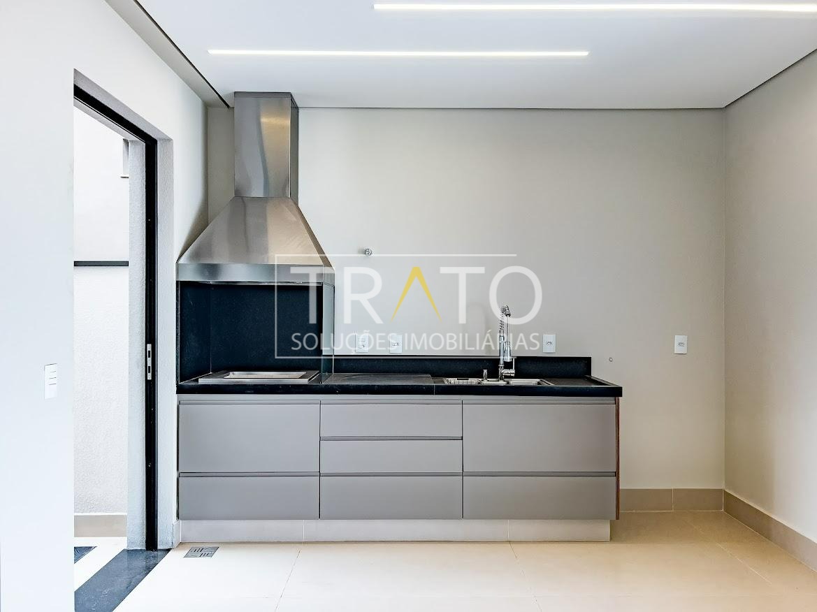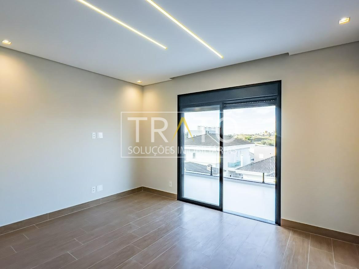 Residência moderna no Condomínio Zurich Dorf, Valinhos. Conta com 3 suítes no piso superior e 1 cômodo multiuso no térreo (opção de 4ª suíte ou escritório). São 5 banheiros no total, sendo 3 nas suítes, 1 integrado ao cômodo multiuso (lavabo) e 1 de apoio à área gourmet.