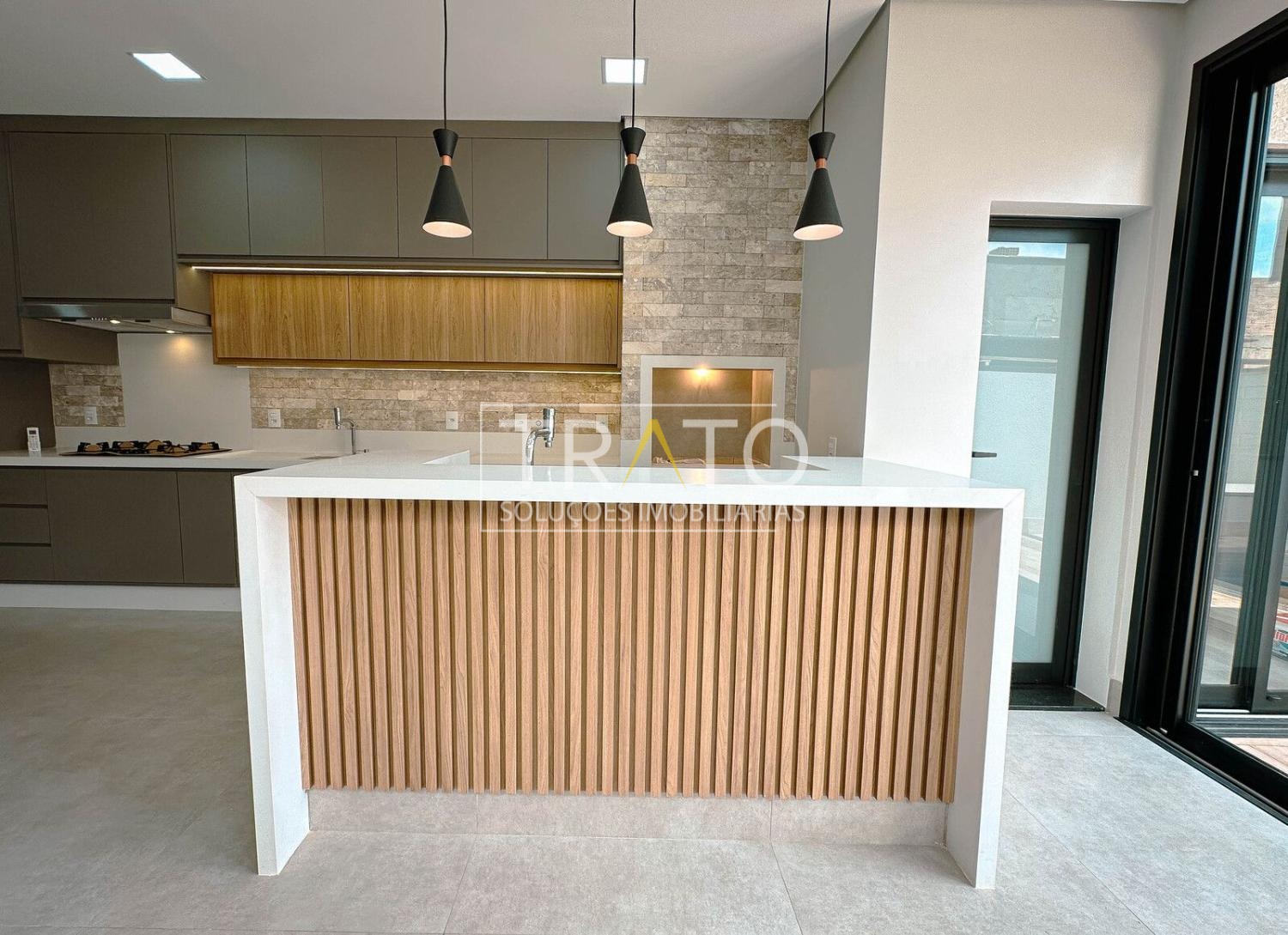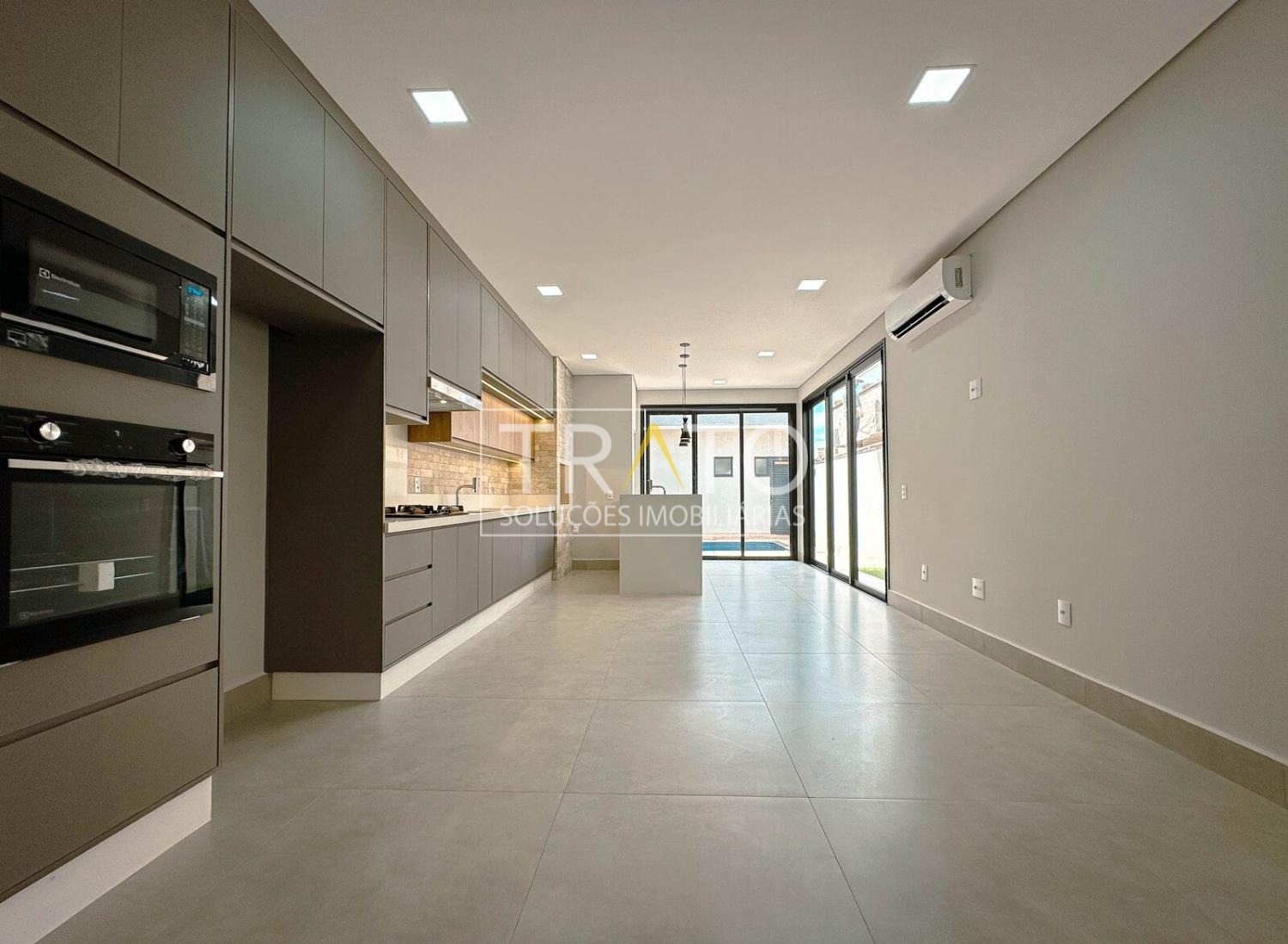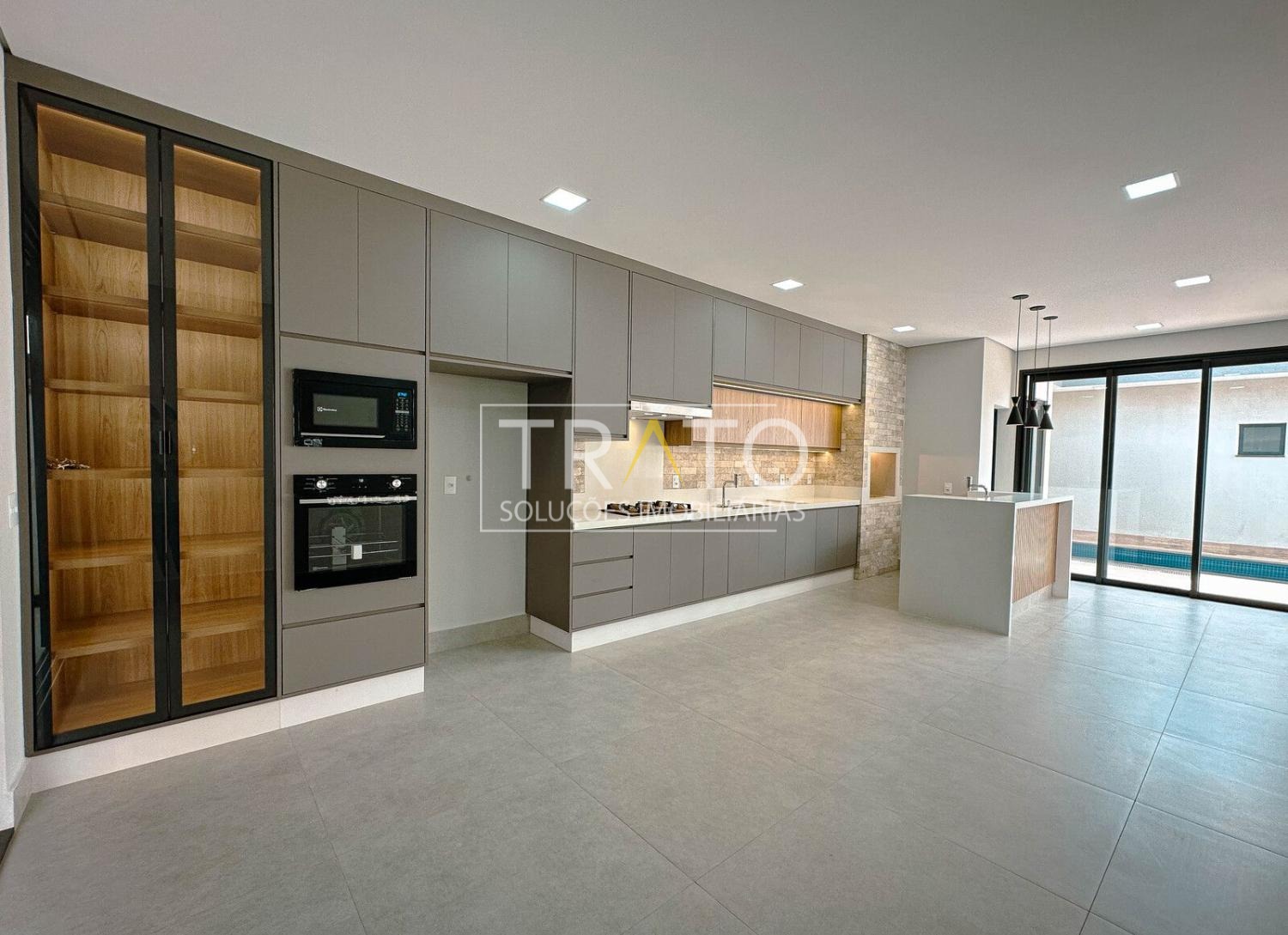 Sala para 2 ambientes com pé direto duplo, cozinha em estilo americano rica em armários planejados; 3 suítes com armários planejados, sendo a máster com closet; escritório; espaço gourmet com churrasqueira e quintal com piscina.