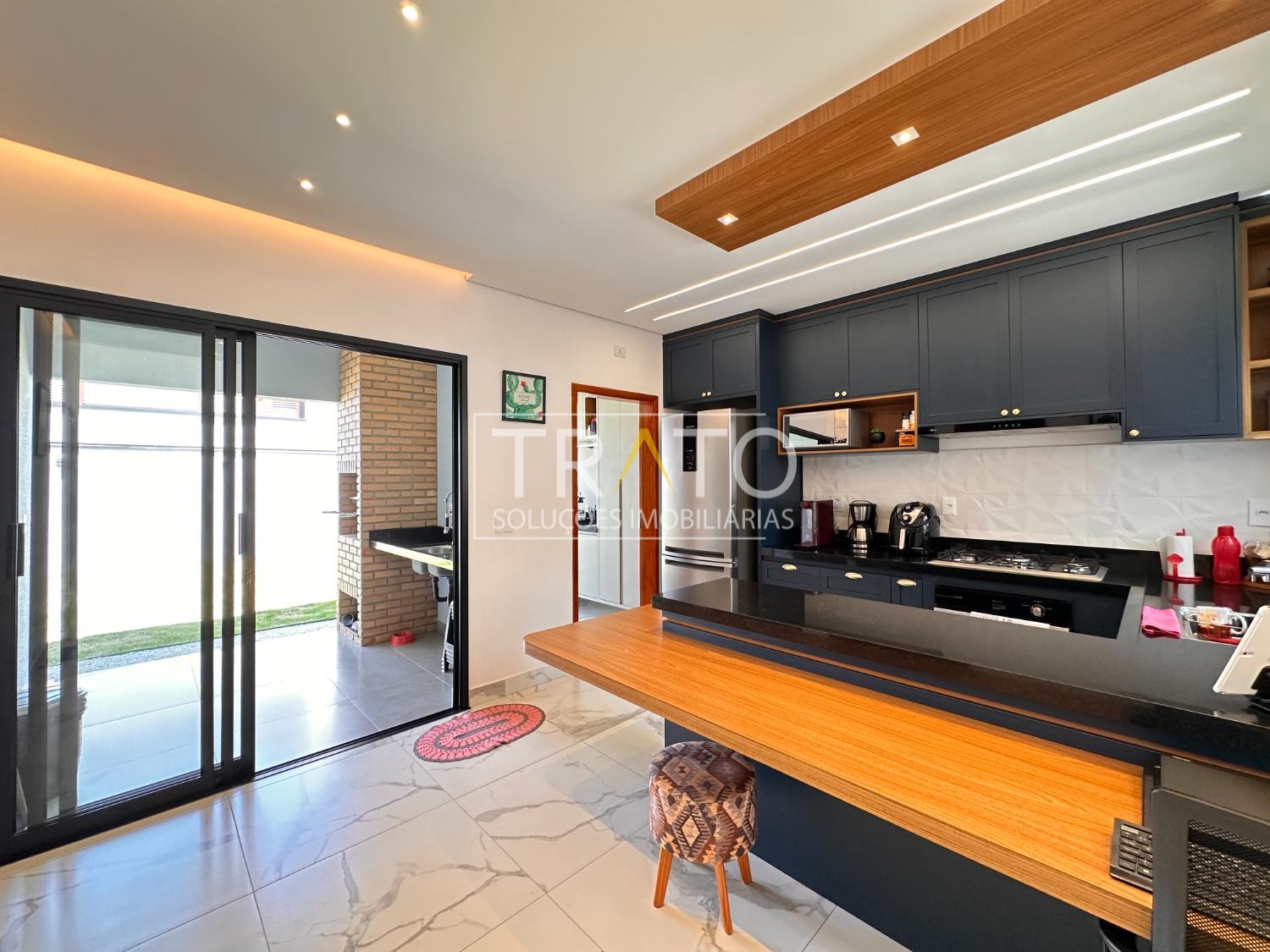 Projeto moderno, conceito aberto, ambientes integrados. Sala para 2 ambientes - TV e jantar, cozinha estilo americana com bancada e muitos armários planejados, cooktop, espaço gourmet com churrasqueira, lavanderia, banheiro social.