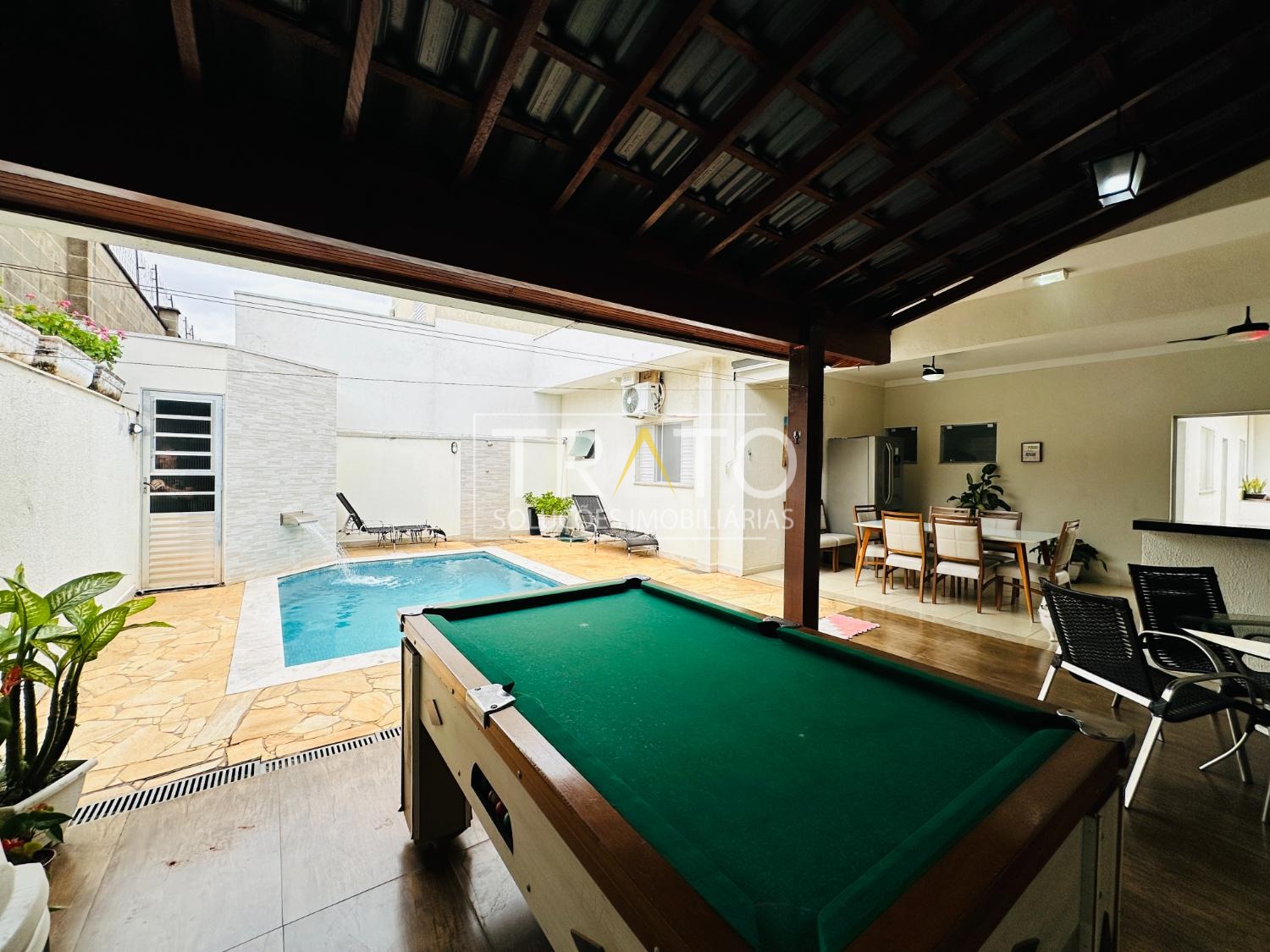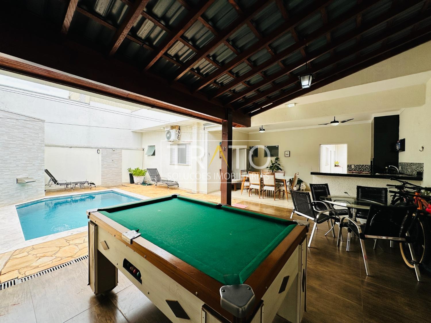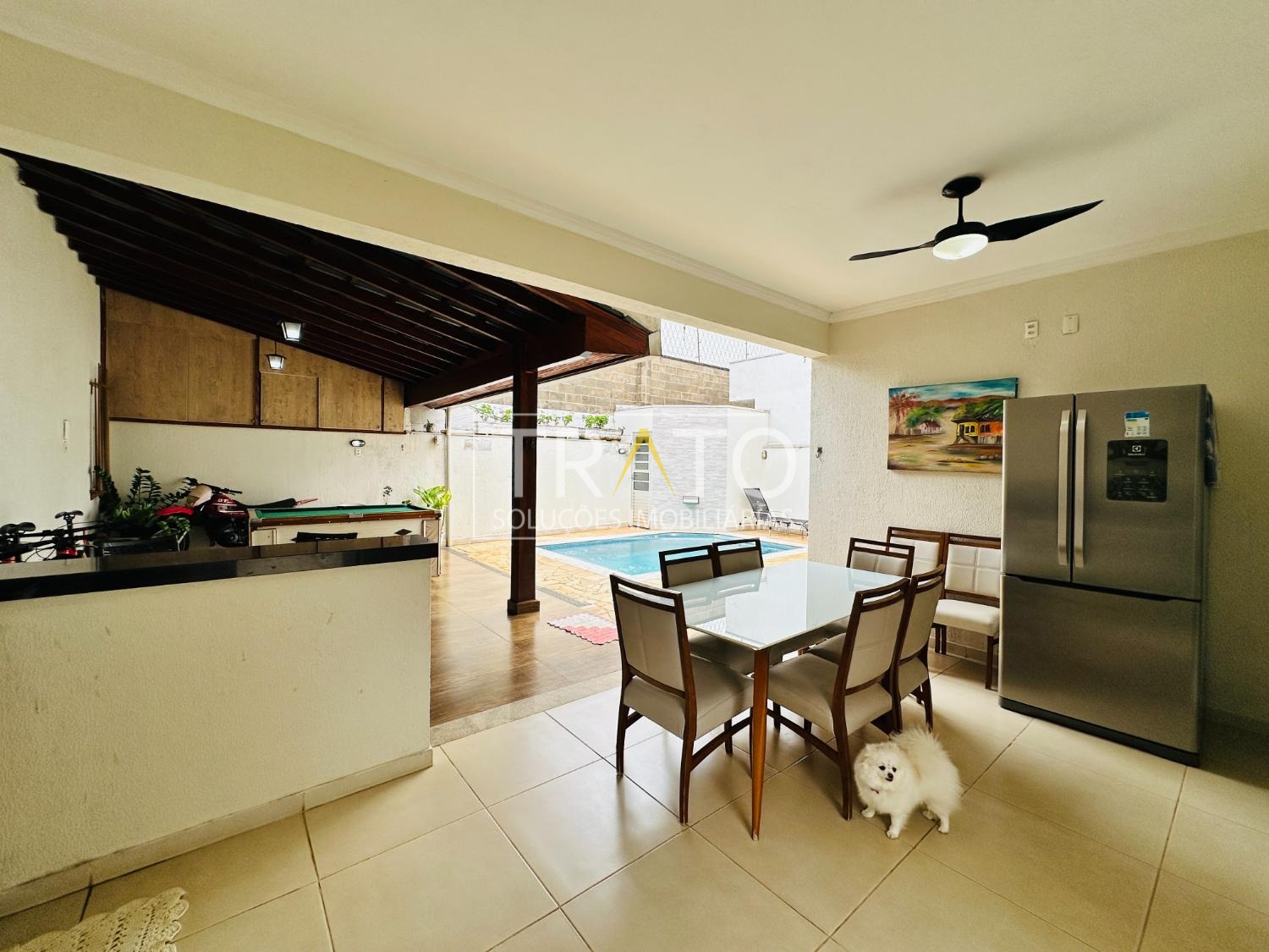 Area gourmet com churrasqueira, armários planejado, geladeira, mesa, mesa de sinuca