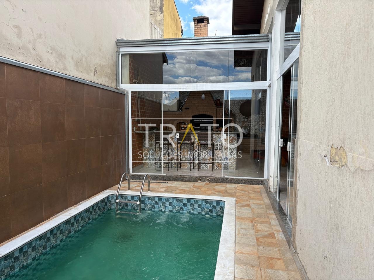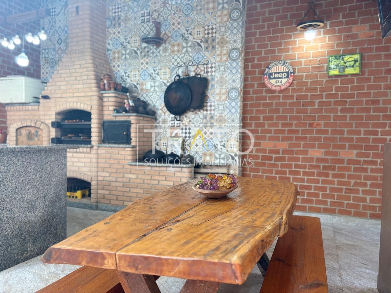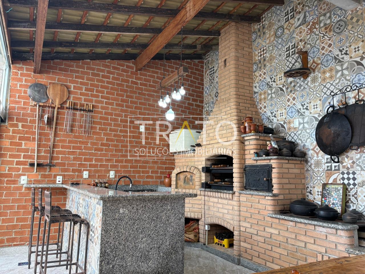 Área gourmet completa, com piscina, churrasqueira, fogão a lenha e pizza.