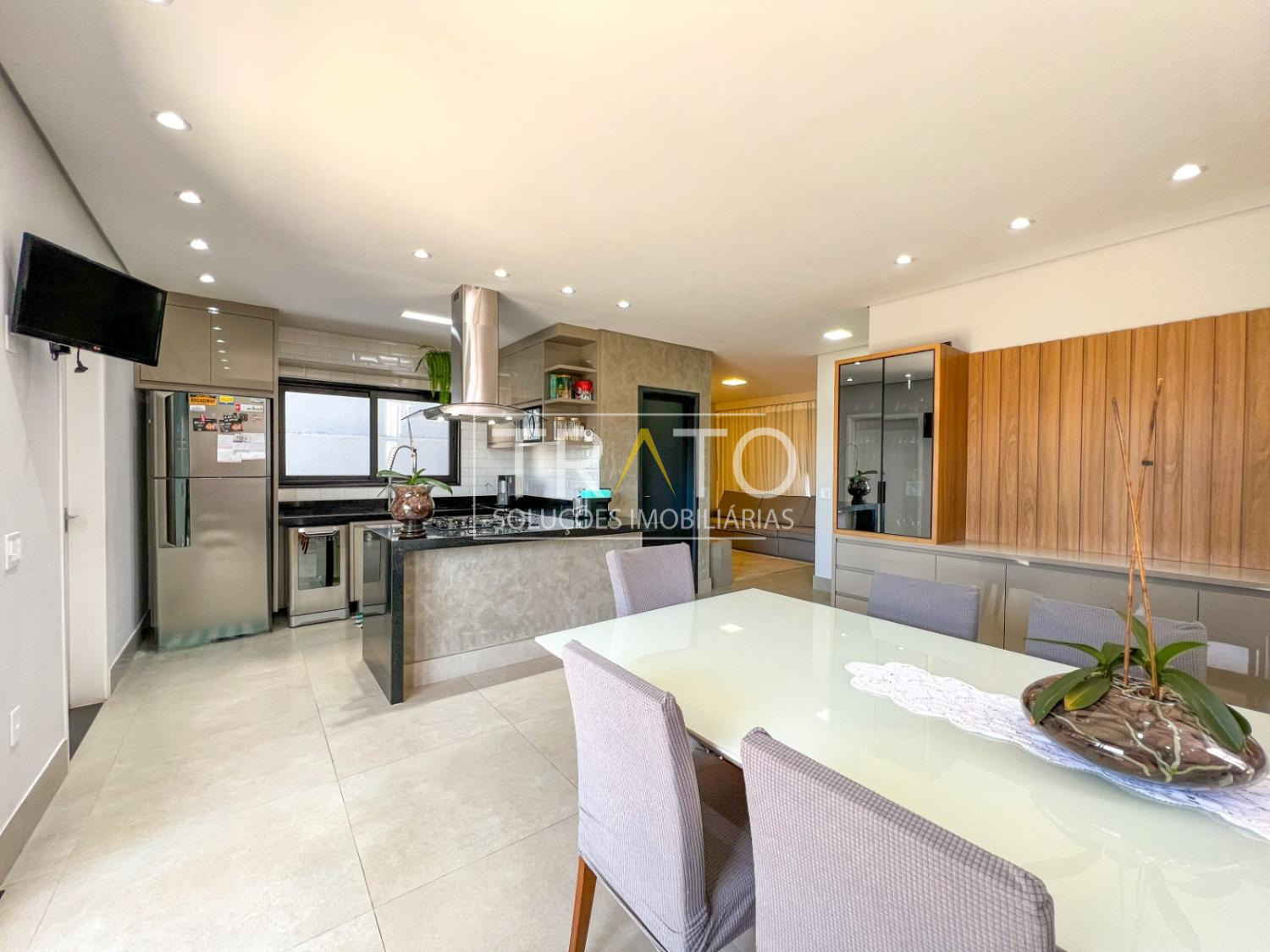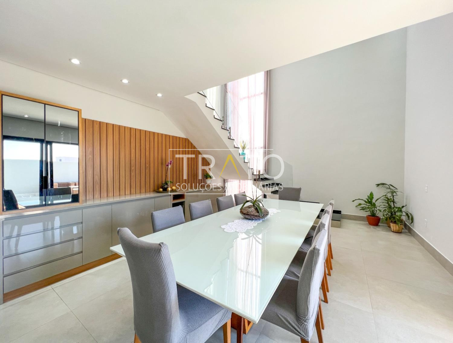 - Piso térreo com garagem, living com pé-direito alto e feito para 2 ambientes, sala de TV, cozinha rica em planejados com despensa e lavanderia