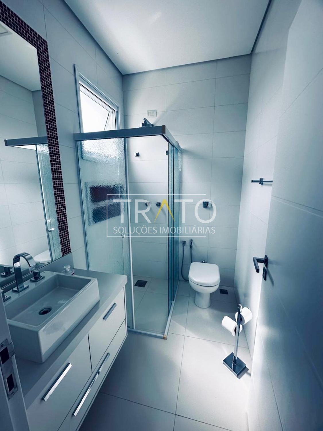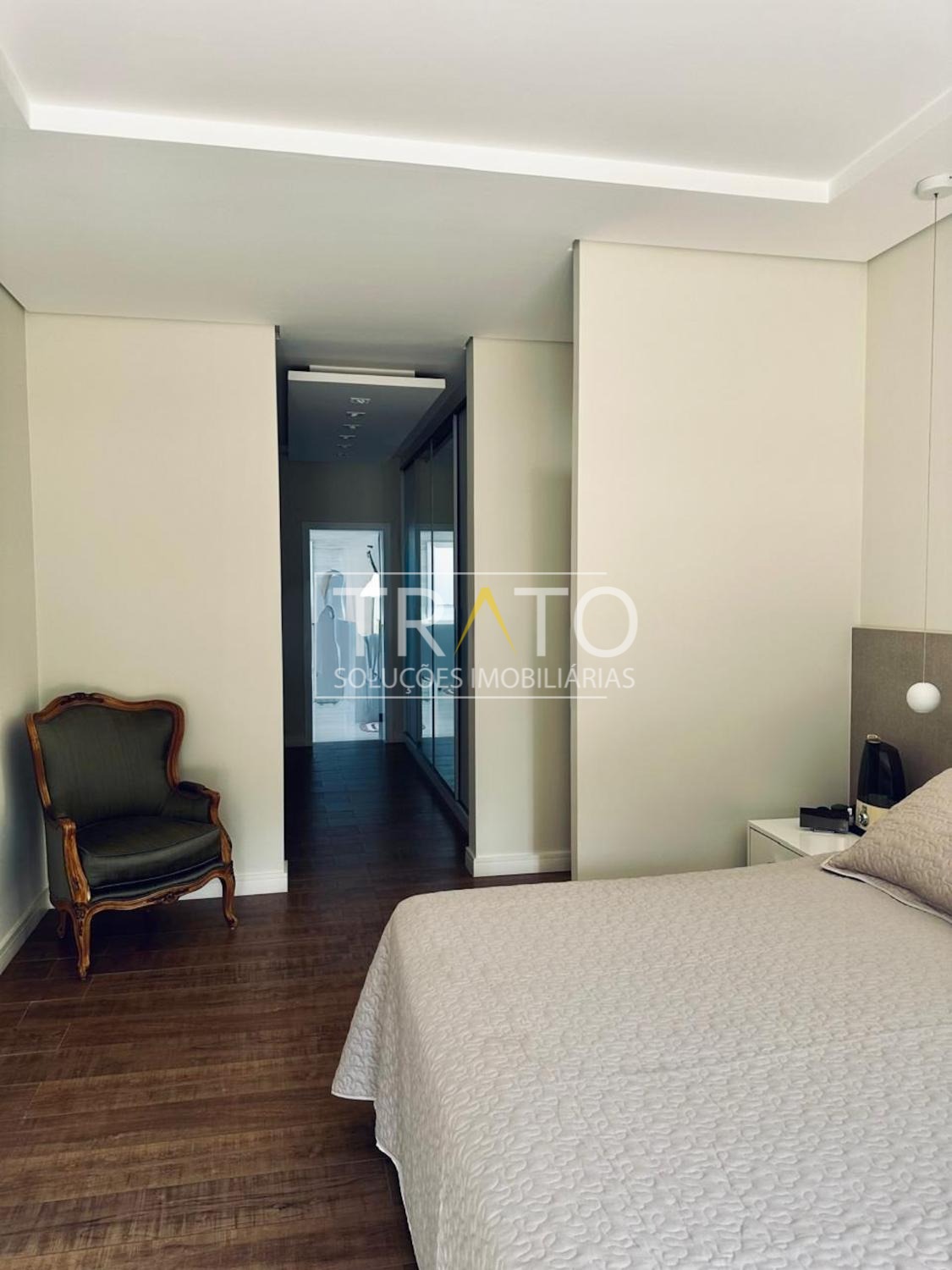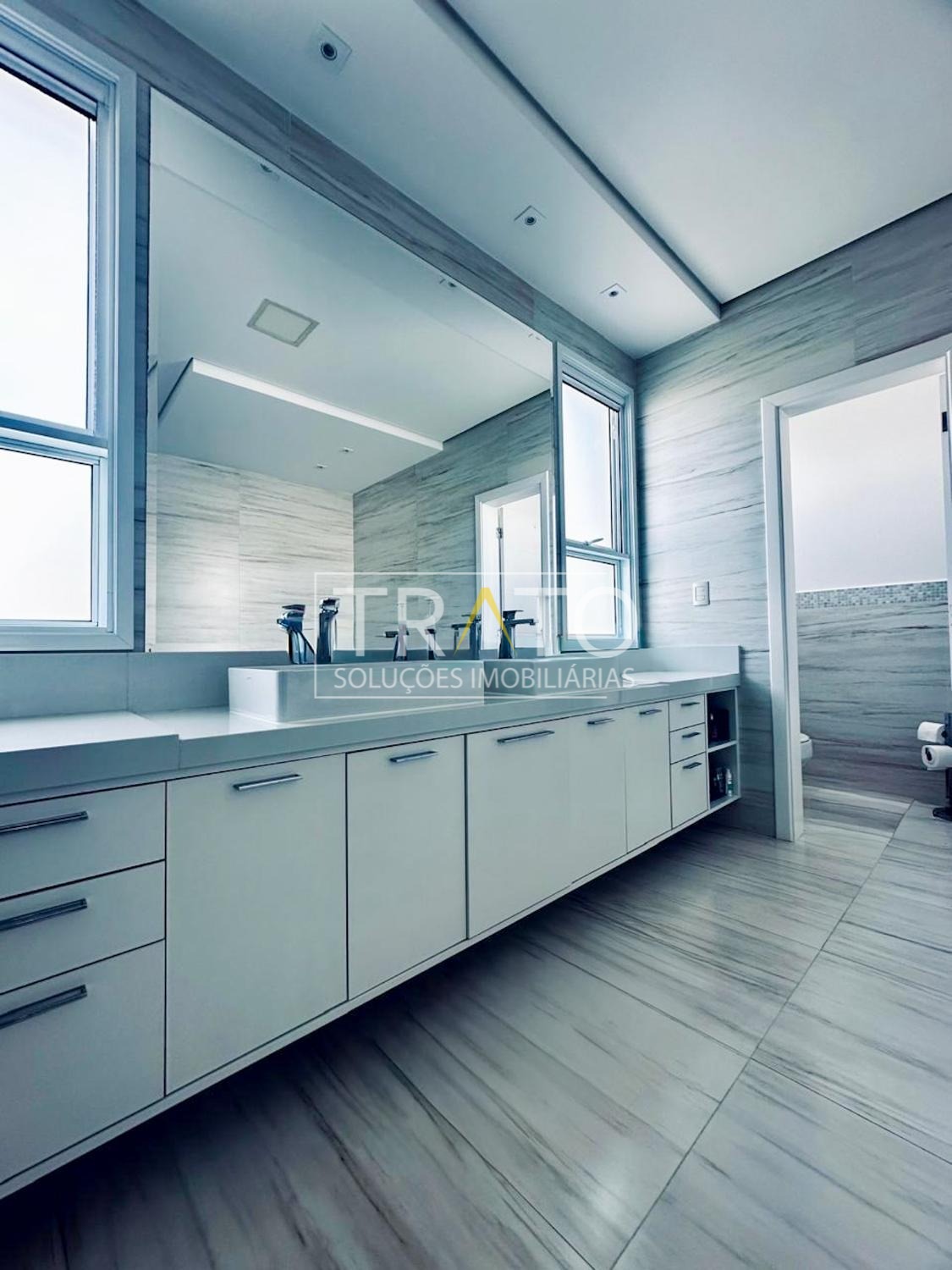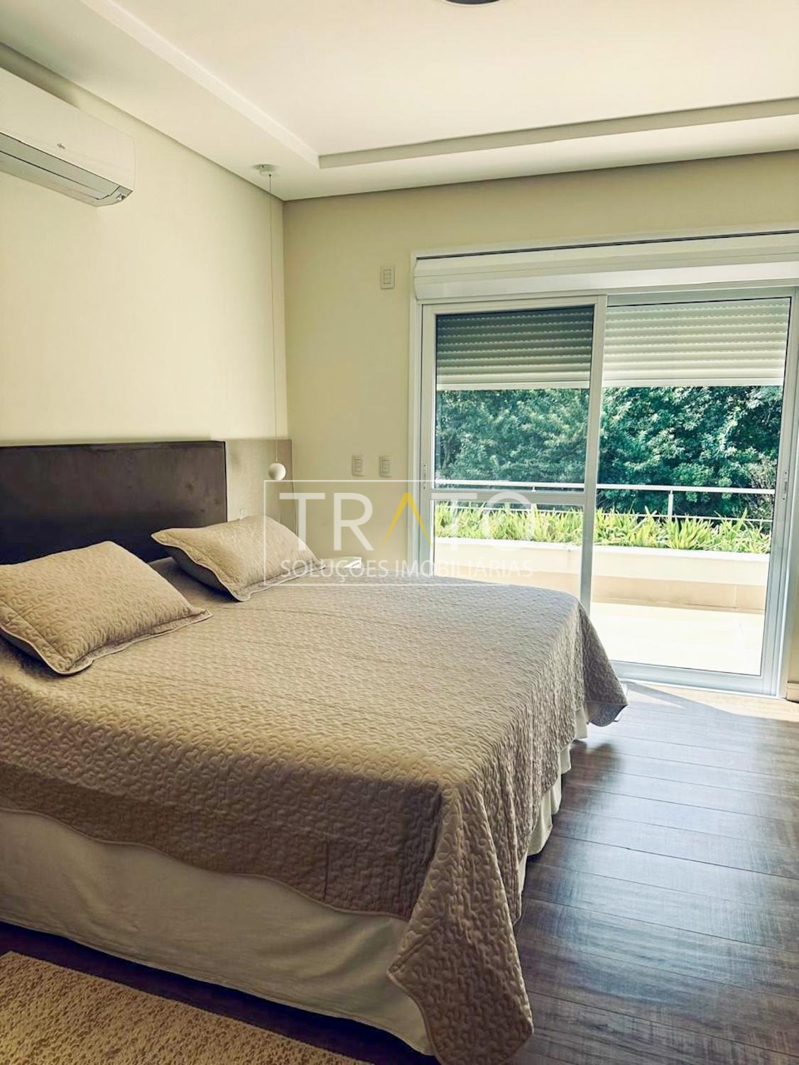 O imóvel possui cinco suítes, sendo uma no térreo. A suíte master é um dos grandes destaques, com janela piso-teto automatizada e vista privilegiada para a área verde, amplo closet com sete metros de armários planejados e banheiro com hidromassagem e duas cubas.