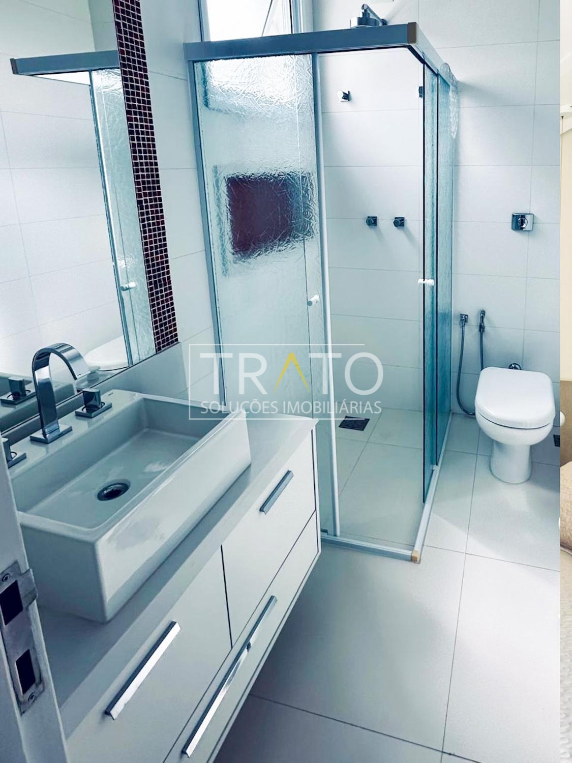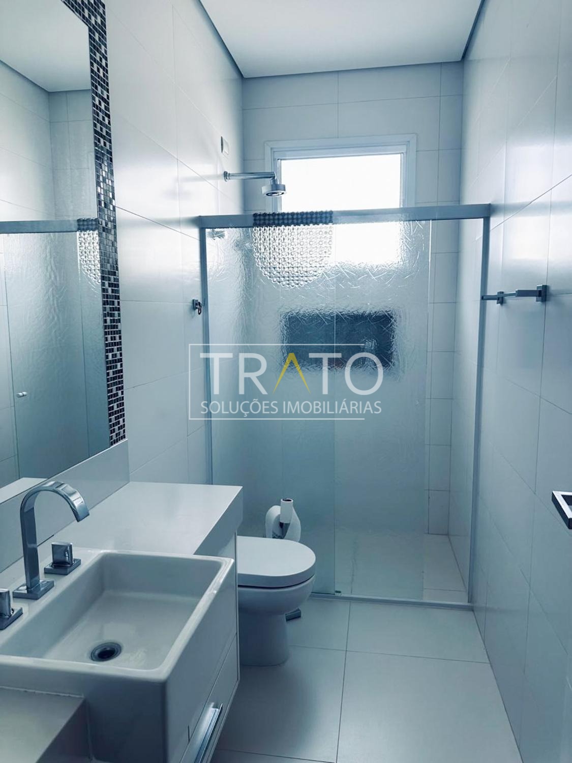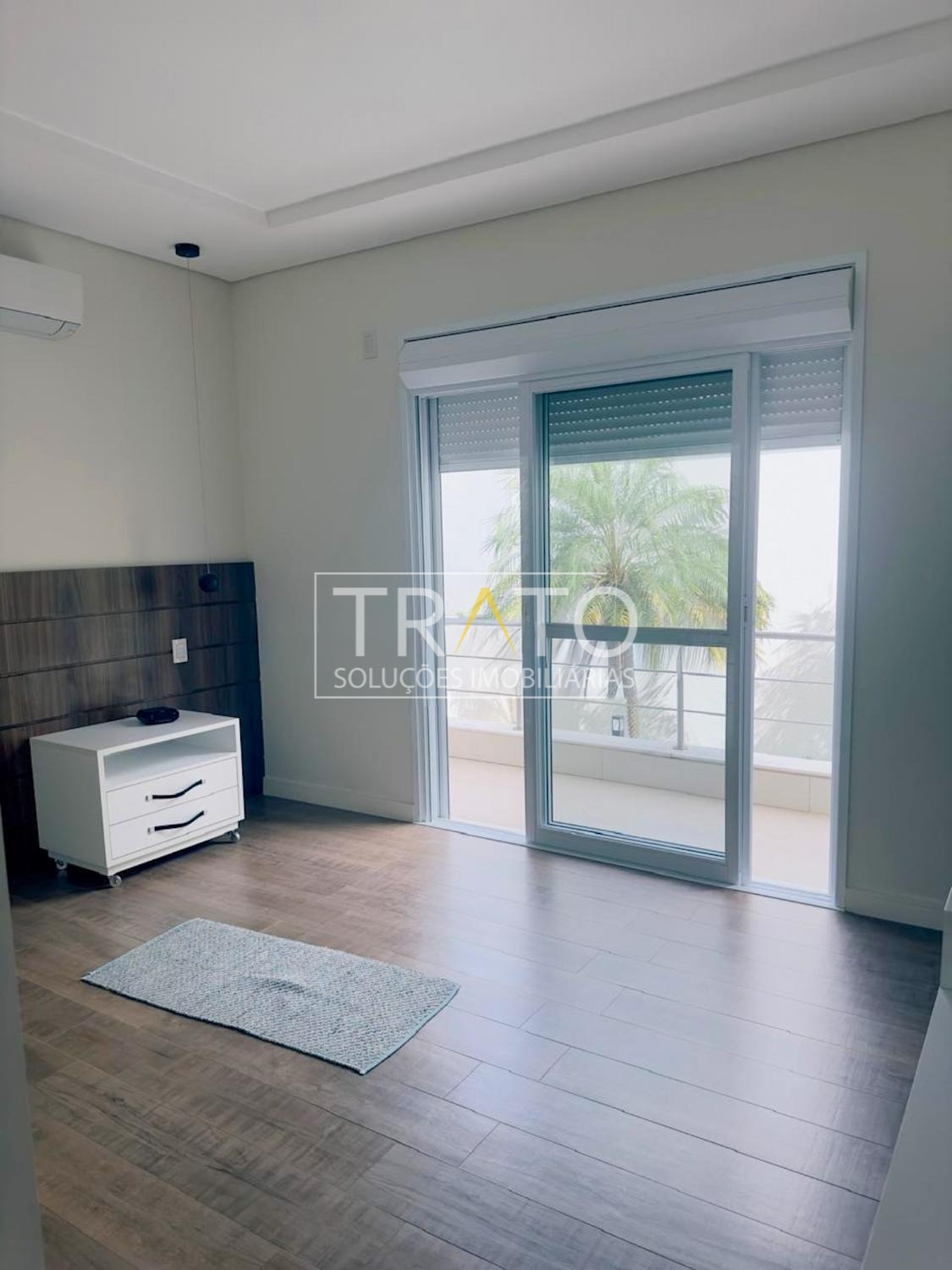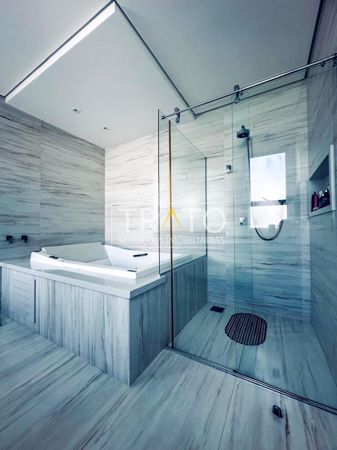 O imóvel possui cinco suítes, sendo uma no térreo. A suíte master é um dos grandes destaques, com janela piso-teto automatizada e vista privilegiada para a área verde, amplo closet com sete metros de armários planejados e banheiro com hidromassagem e duas cubas.