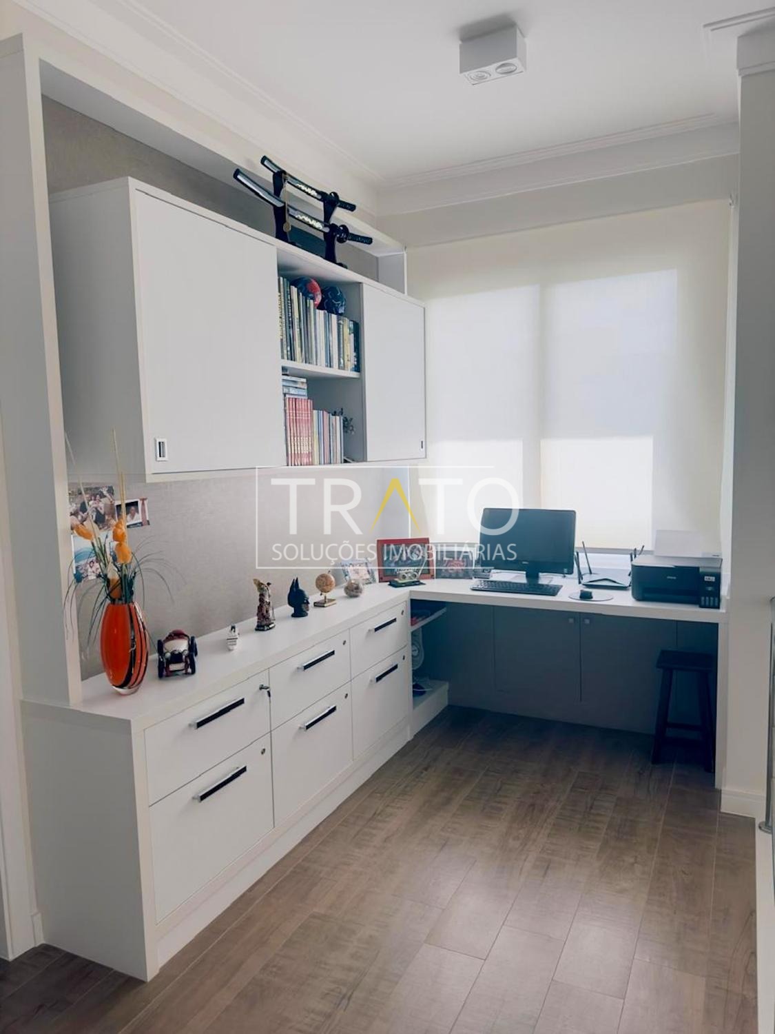 A casa é rica em armários planejados, com projeto assinado por arquiteta de interiores, além de roupeiro piso-teto em laca branca. Conta ainda com escritório aberto com vista para a preservação, home theater e escada revestida em Silestone branco. Todos os ambientes possuem porcelanato Portobello, agregando sofisticação e durabilidade.