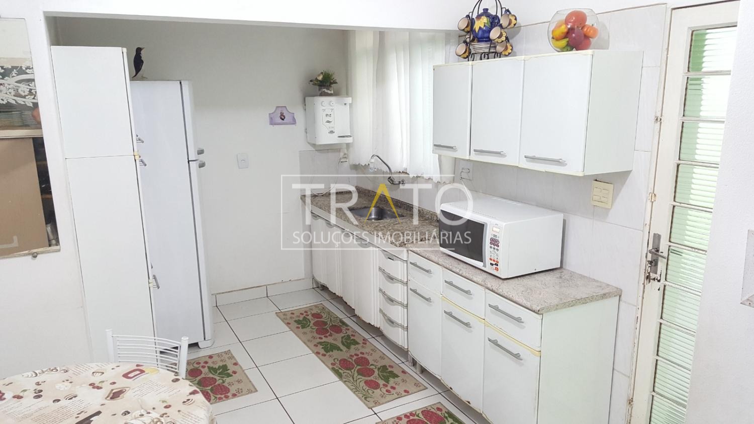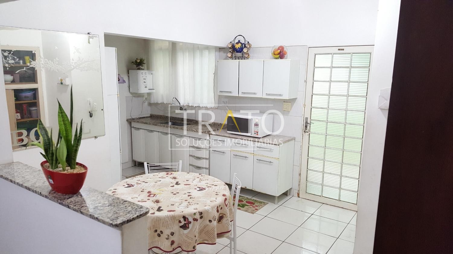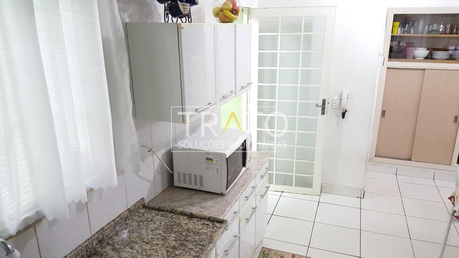 Cozinha ampla com armários e no quintal uma edícula com churrasqueira.
