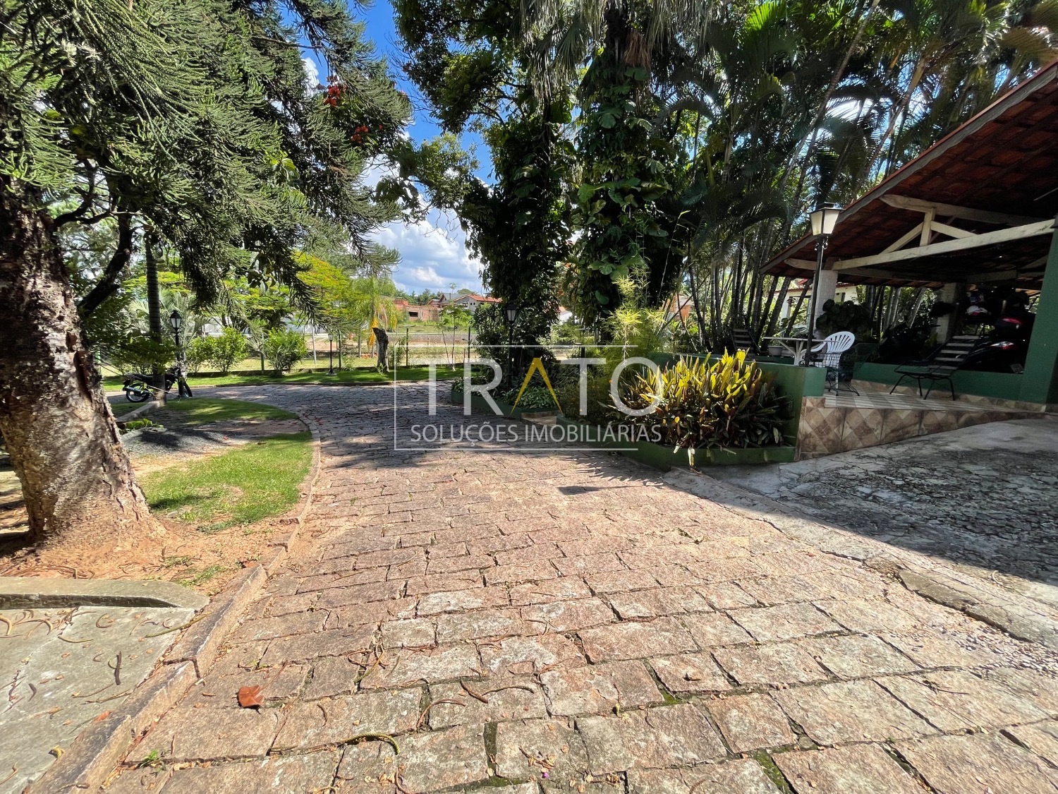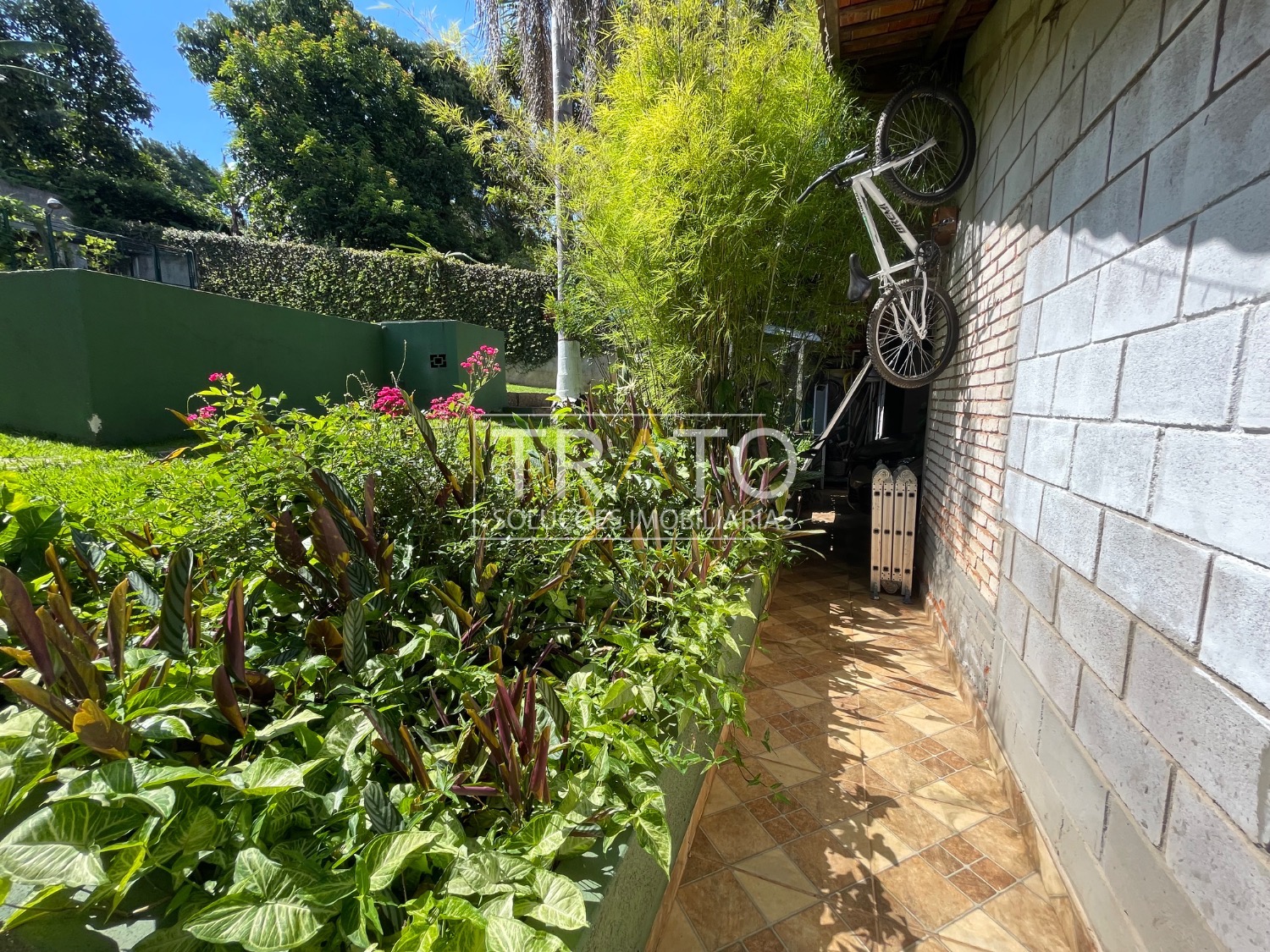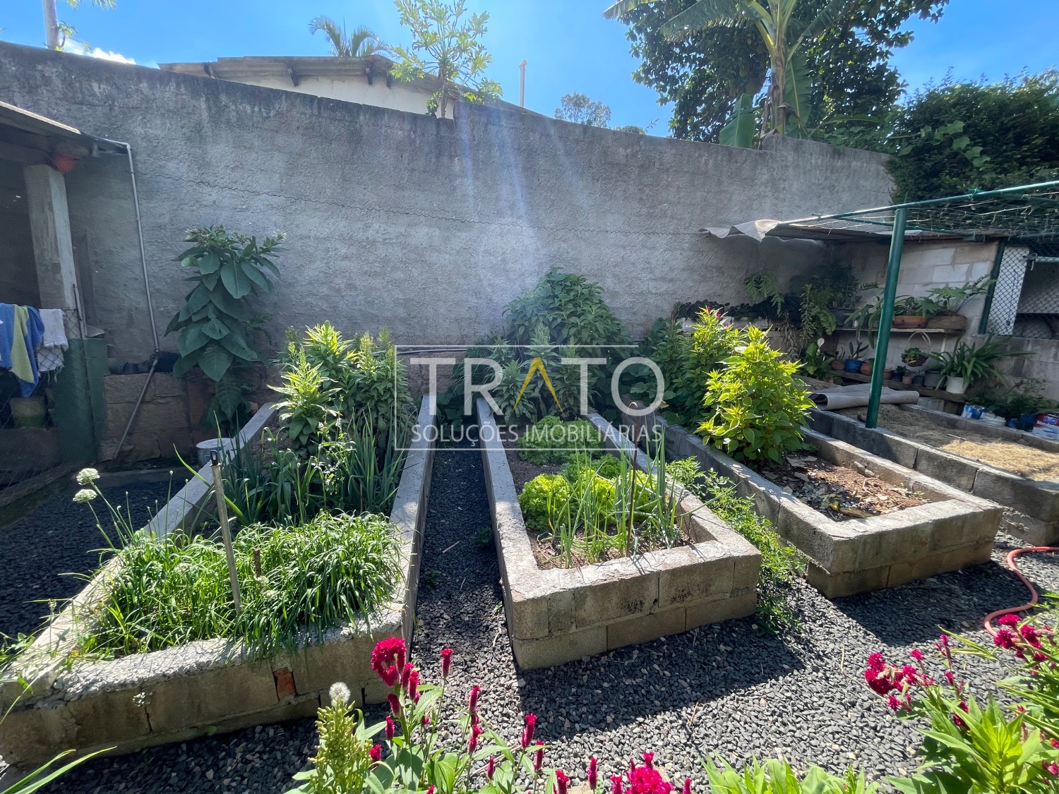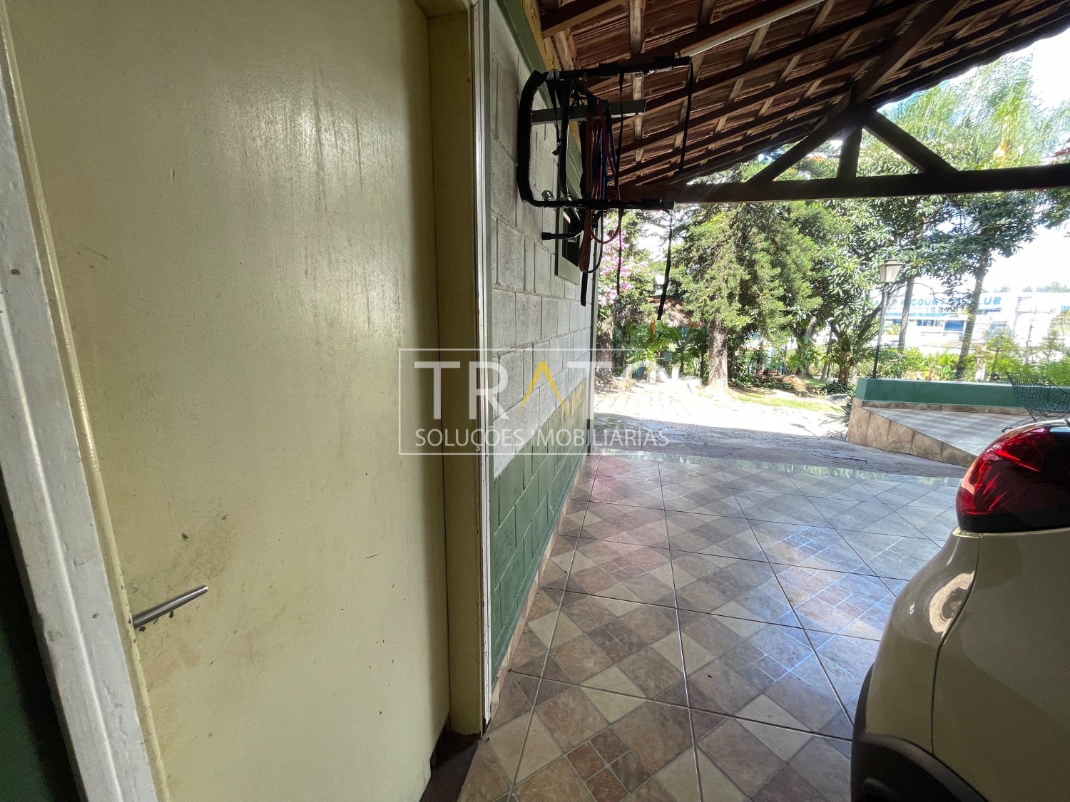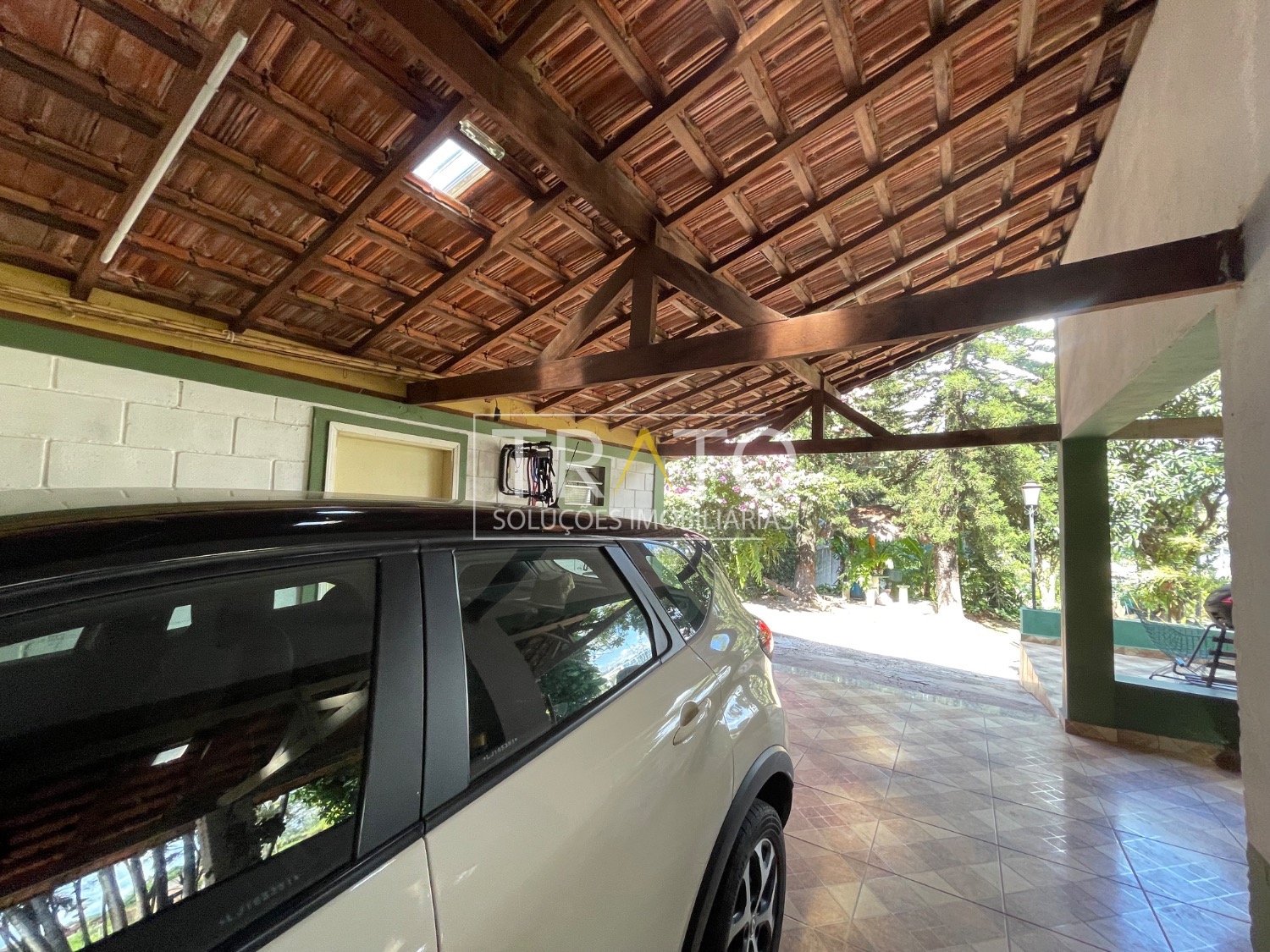 O imóvel dispõe de 1 vaga de garagem coberta e 2 descobertas, além de amplo espaço para estacionamento de carros e motos. Possui também horta e área externa generosa.