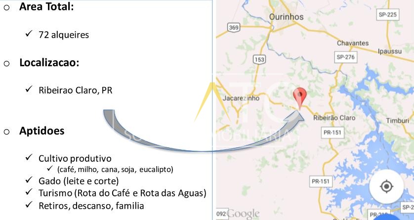 Fazenda com mais de 1 milhão de m², localizada a 6 km da cidade de Ribeirão Claro/PR com vocação para turismo, condomínios sustentáveis e hotéis A temperatura cai um pouco, a brisa fresca acompanha o sol que se dirige ao horizonte. Maritacas celebram alegremente a recolhida ao ninho antes do anoitecer. É uma festa! Uma farra imensa! Sentada na sala avarandada e bem arejada, abraçada pelo enorme e acolhedor flamboyant saboreio este espetáculo.