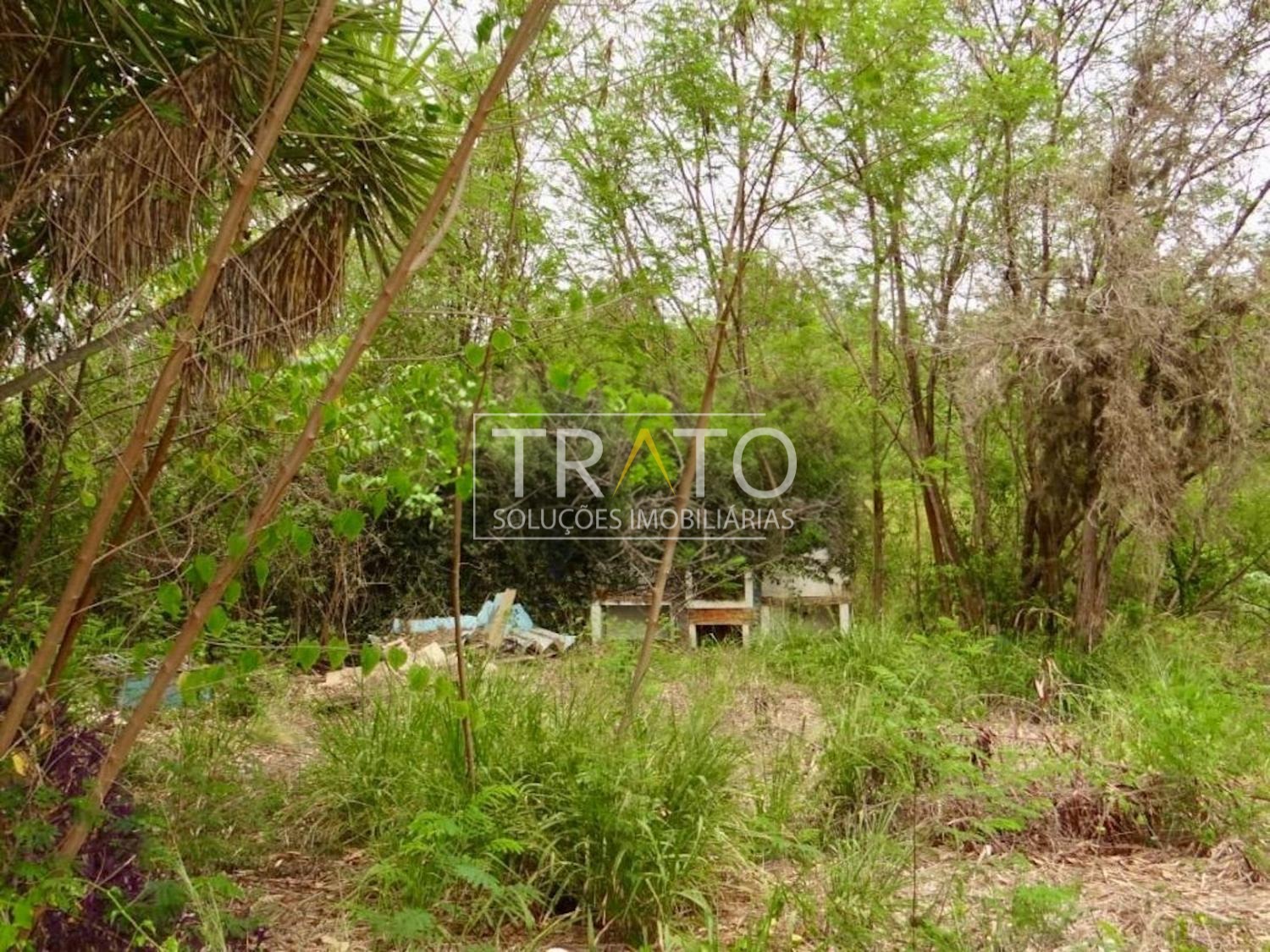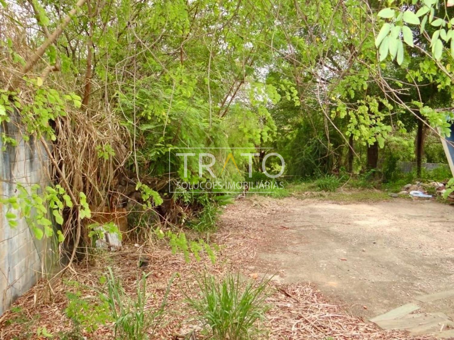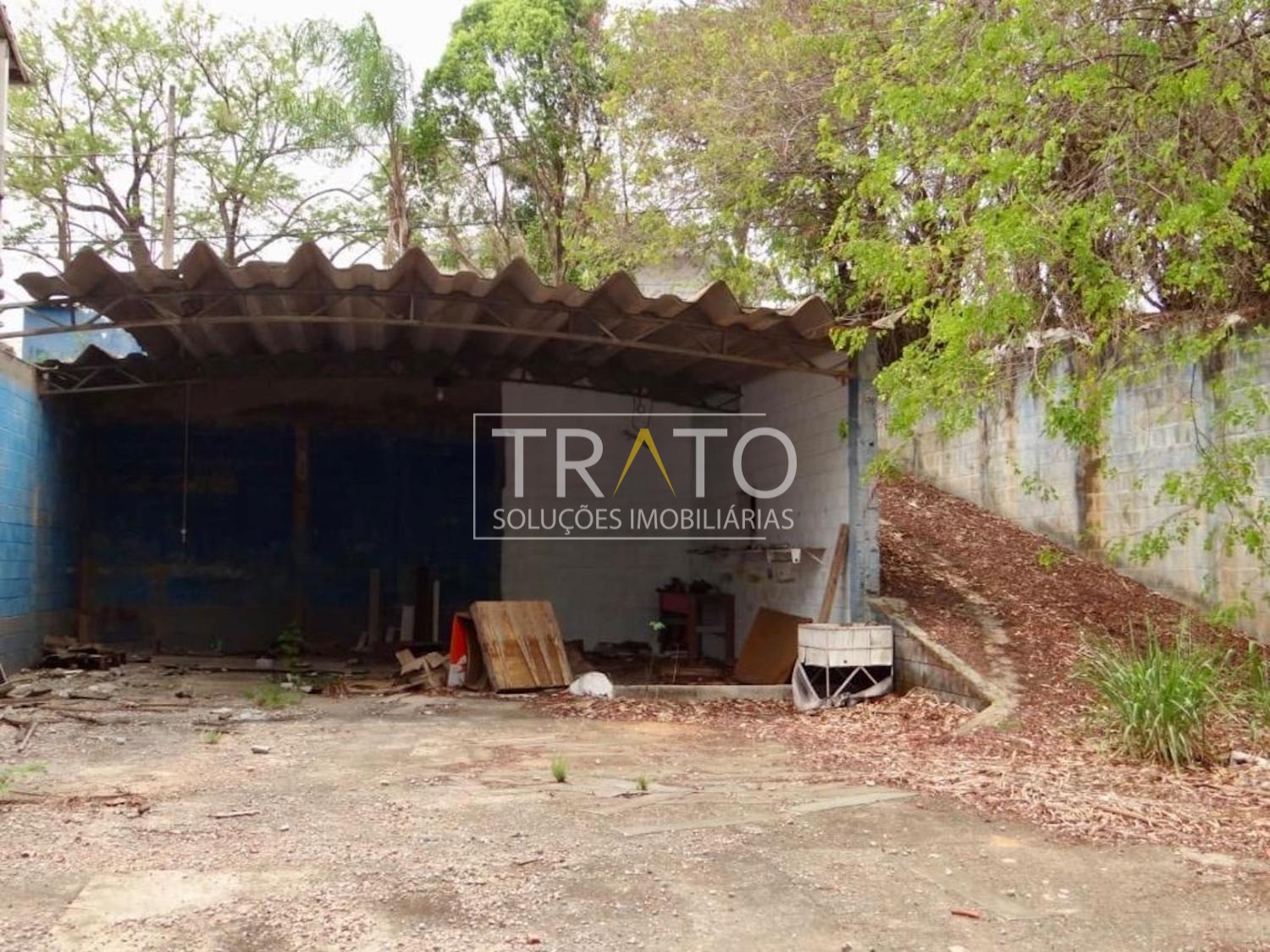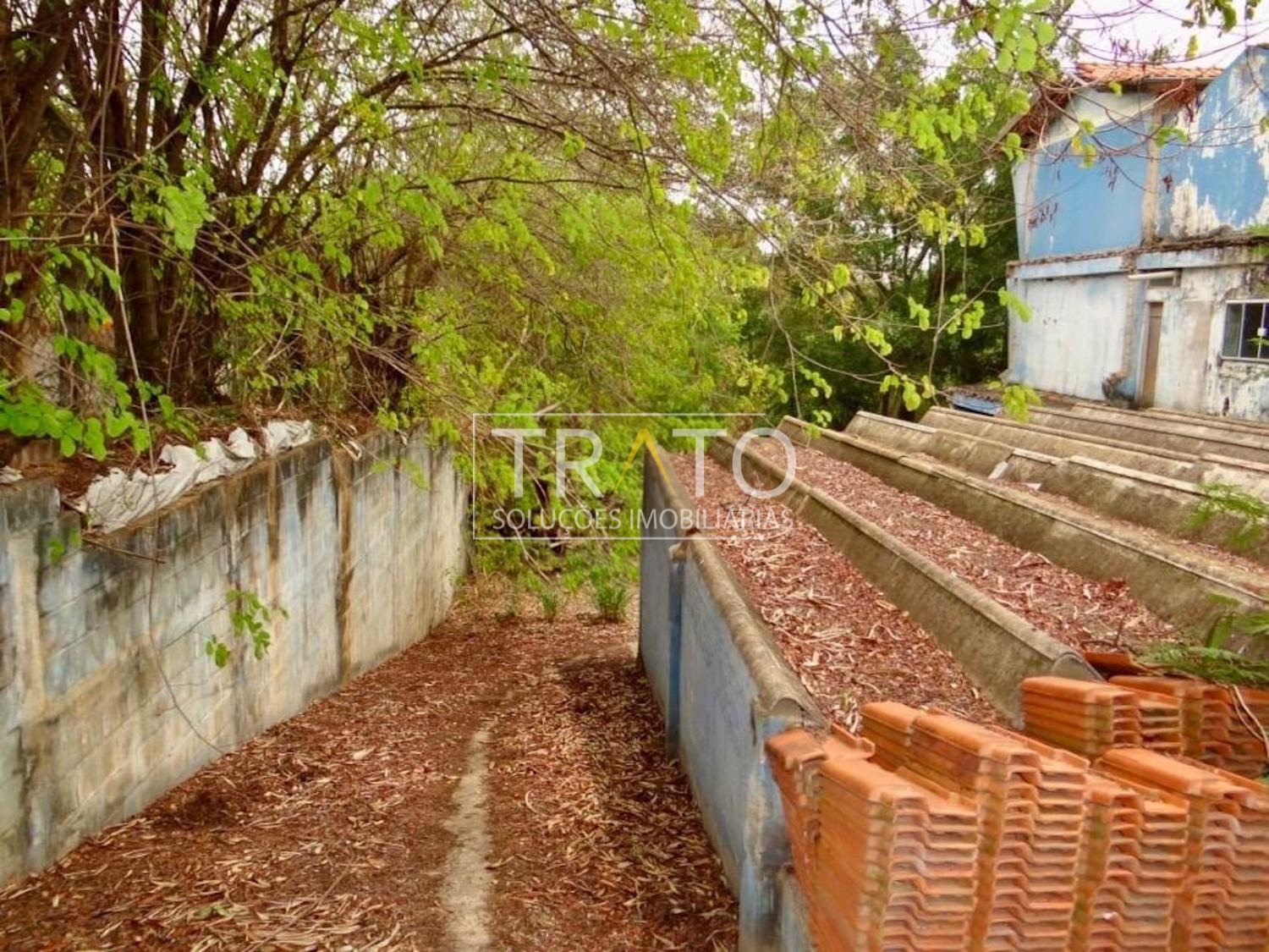 Terreno à venda plano, murado e com um barracão já construído. Ao fundo, há uma mina d'água (não faz parte da propriedade).